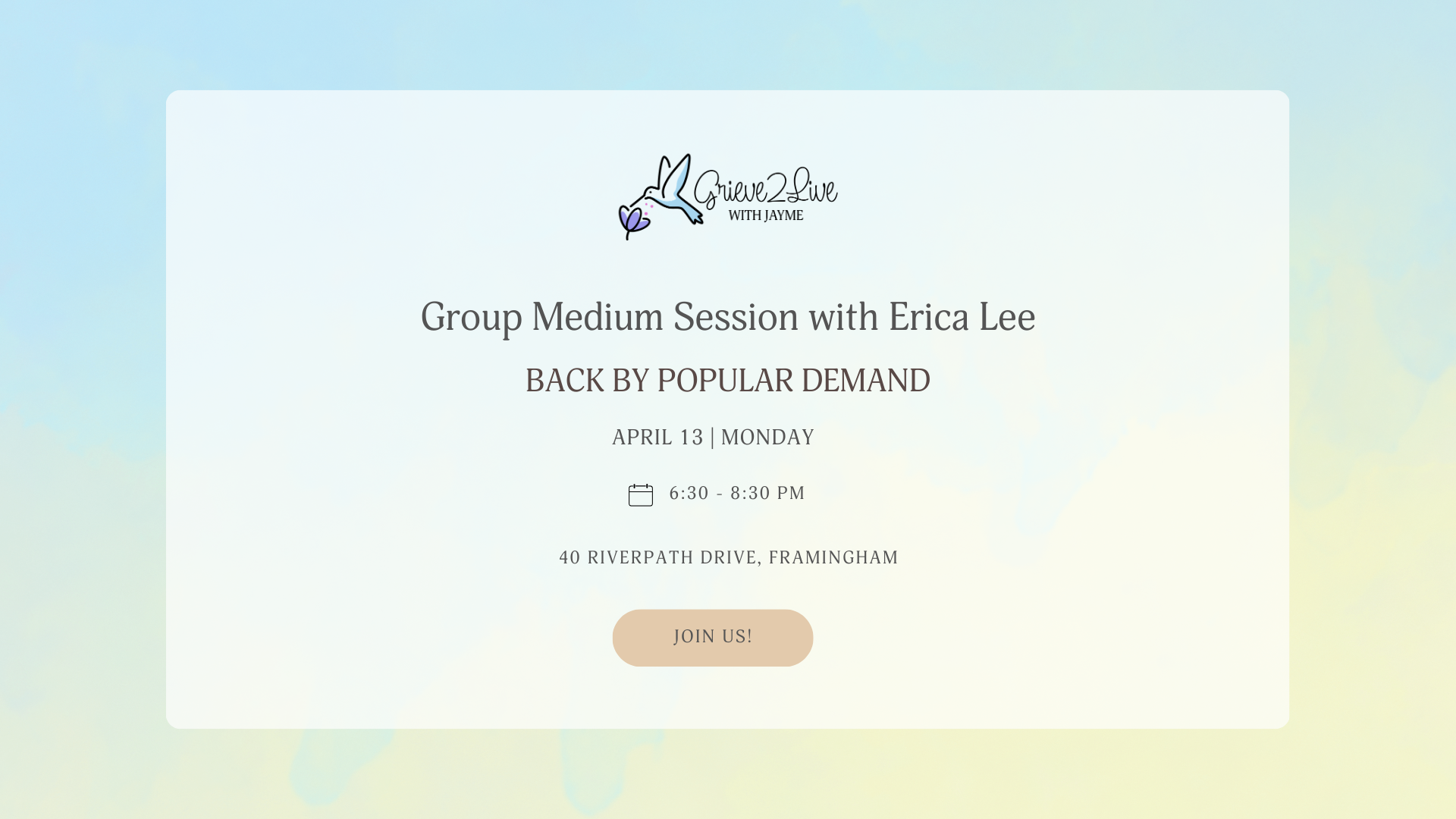Join us for a deeply meaningful evening with gifted medium Erica Lee, where messages from loved ones in spirit are shared in a supportive and intimate group setting.